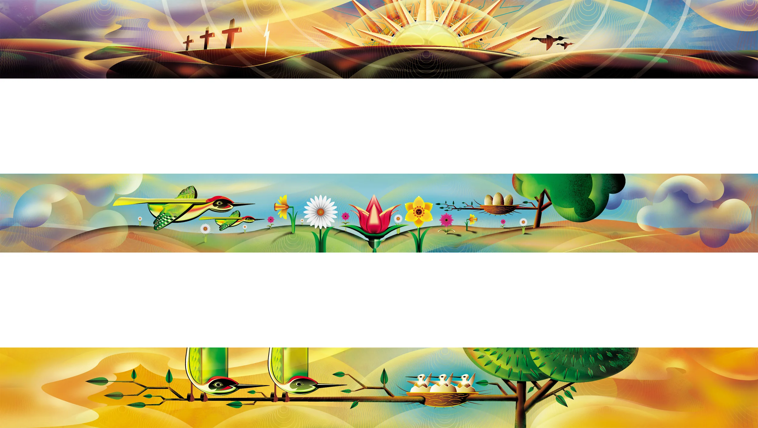 Good Friday was the first image sketched out - working around a strong sunrise in the centre and gathering storm clouds above the crosses on the lhs, balanced with the birds in silhouette crossing the scene on the rhs.